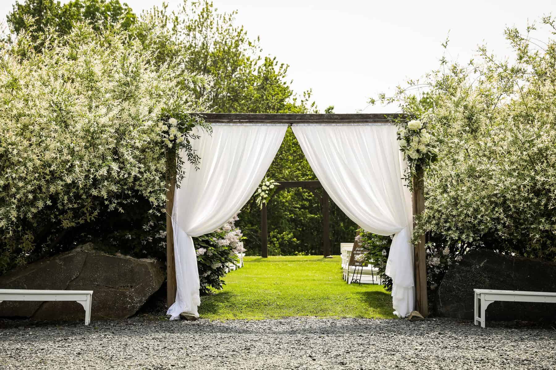Meadow ceremony area with arbor and seating