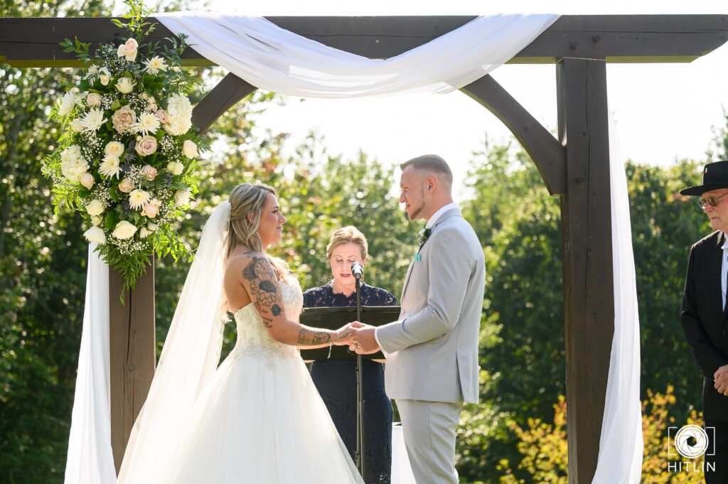 Custom ceremony arbor and white benches